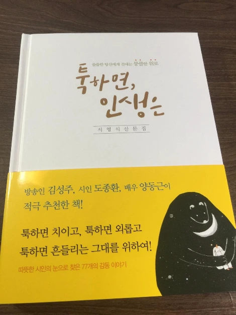 <툭하면, 인생은> 은 고되고 쓸쓸한 날들 가운데 서영식에게 강림했던 일상의 작은 깨달음들을 시라고 해도 좋고 산문이라고 해도 좋을 문체로 풀어낸 에세이집이다. 위 '잘자라, 멍게'는 36페이지에 나온다. 나머지 글들도 전부 그렇게 따듯하고 뭉클하다. 읽다가 한번에 다 읽어내리기가 아까워 잠시 멈추는 책이 있다면 이 책이 그 책이다. 그림이나 사진도 정성스럽고 애틋하다.