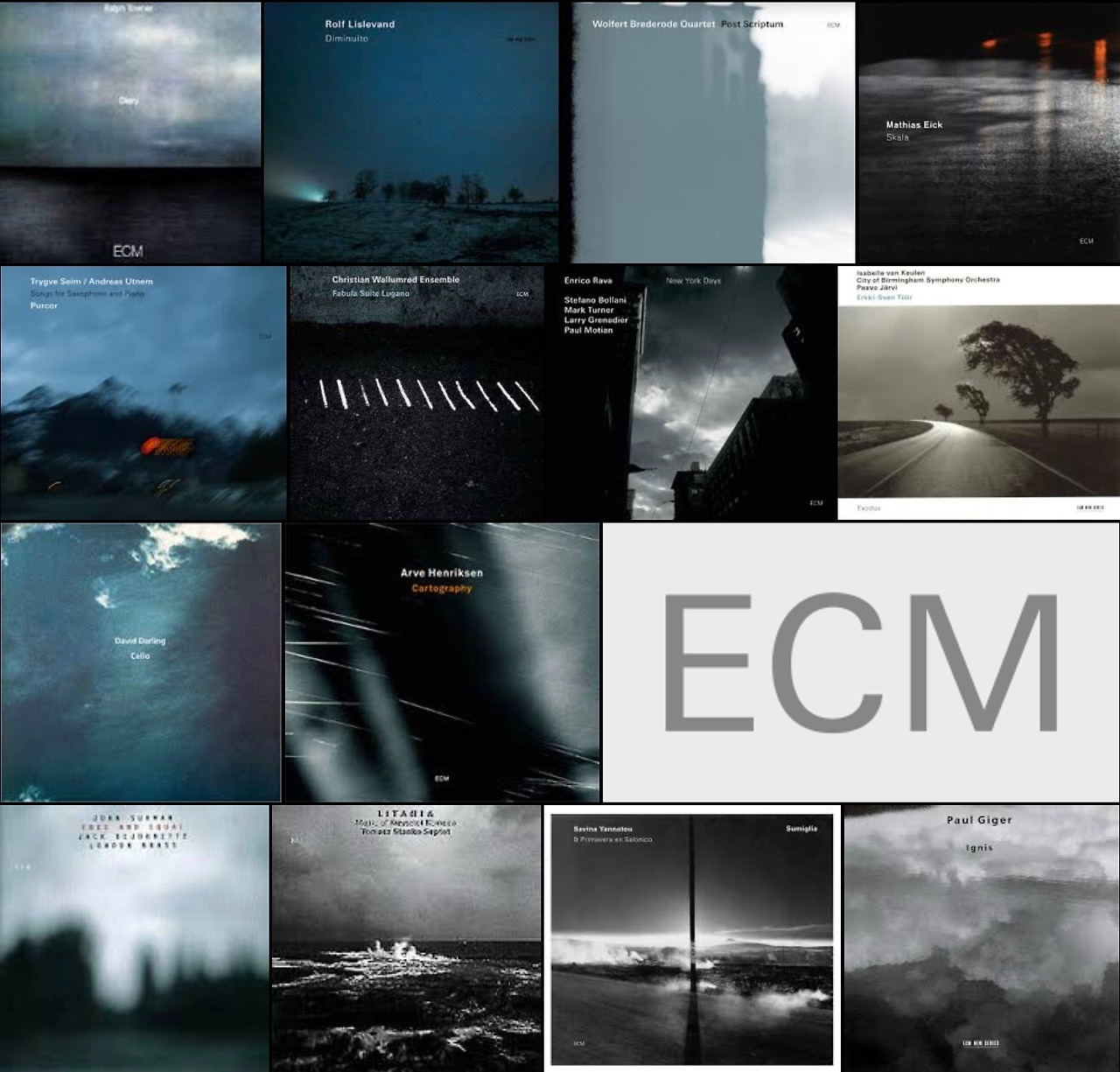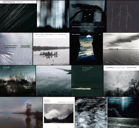 위에서 보듯이 ECM 음반의 커버 디자인은 어둡고 짙은 무채색, 혹은 청록색 계열의 모노크롬 색조를 기반으로 극히 추상화된 바다, 하늘, 숲 등의 풍경그림이 주를 이룬다. 그 풍경속에서 세계는 폭풍우가 치고 불빛은 불안하게 흔들리며 인적은 자취가 없다. 거기에 앨범 타이틀이나 음악가를 표시하는 폰트는 극히 실용적인 기능만 할 뿐이고 여타의 장식은 철저히 배제된다. 전체적으로 ECM의 음반 디자인은 음울하고도 내성적이다. 멀리서 보면 그 이미지들은 사바세계 중생들의 소용돌이치는 마음속을 찍어 놓은 듯도 싶다.
