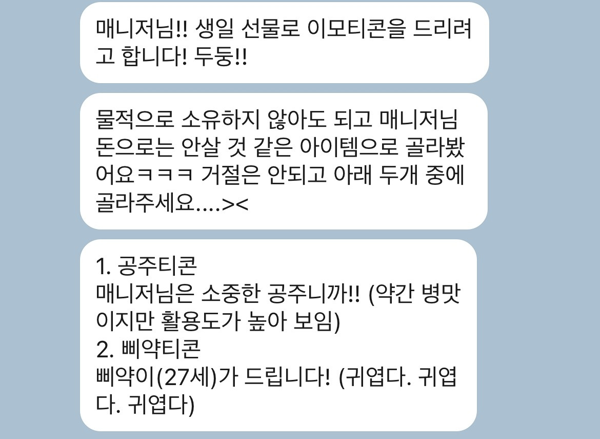 처음 헤어질 때는 삐약이가 울고 나는 울지 않았는데, 이번에는 반대였다. 송별회가 끝나고 삐약이와 함께 탄 지하철 3호선에서 질질 울었다. 왜 그렇게 눈물이 났는지는 지금도 잘 모르겠지만, 내가 삐약이를 너무나 좋아한다는 것만큼은 확실하다. 회사 메신저로 업무 이야기를 보내자 알겠다며 김정은이 메모하는 짤을 보내던, 전팀장을 보며 '왜 중대장이 맨날 실망하는지 알 것 같다'던, 점심 등산에서 나 혼자 낙오했을 때 정상에 있는 고양이 사진을 보내며 유혹하던, 이모티콘을 절대 사지 않는 내게 생일선물로 이모티콘을 보내준, 밀카 초콜릿을 먹고 싶다는 나와 함께 편의점을 가주던 나의 영원한 삐약이. 항상 조심하고, 건강하게 잘 다녀와서 곧 또 만나!