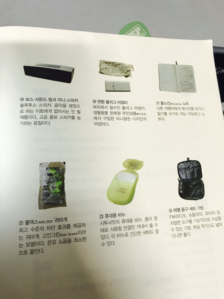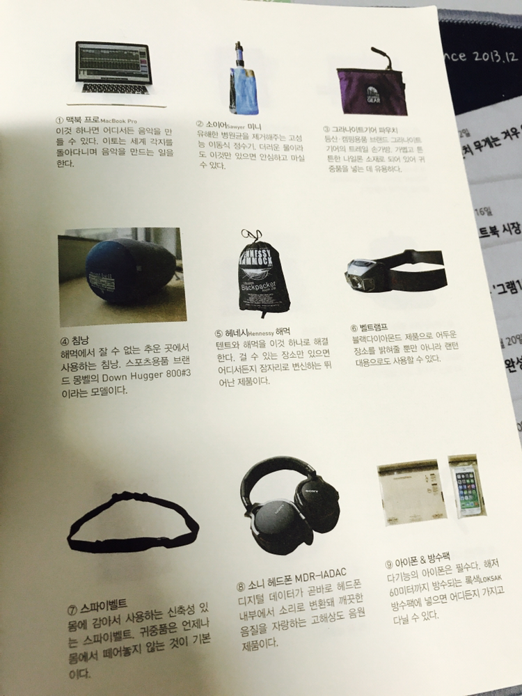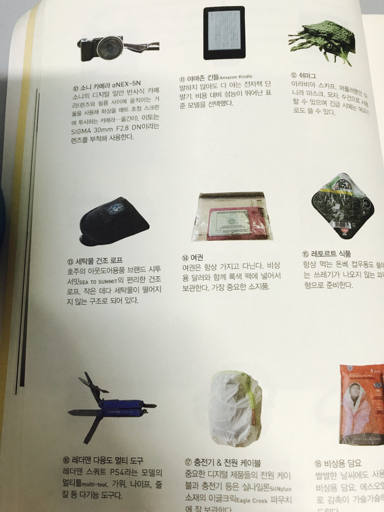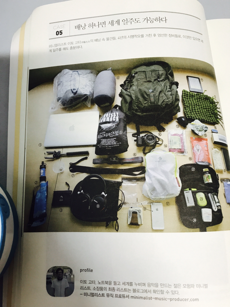 베스트셀러 <우리에게 더이상 물건은 필요없다>에 소개된 #노매드 #미니멀리스트 (이토 고타)의 세계여행을 위한 배낭속 내용물입니다.. 4년간에 걸친 시행착오 끝에 엄선한 물건들이라네요.. 음악 만드는 일을 하는 그는 자신이 좋아하는 일을 하며 전세계를 여행한다고 합니다..