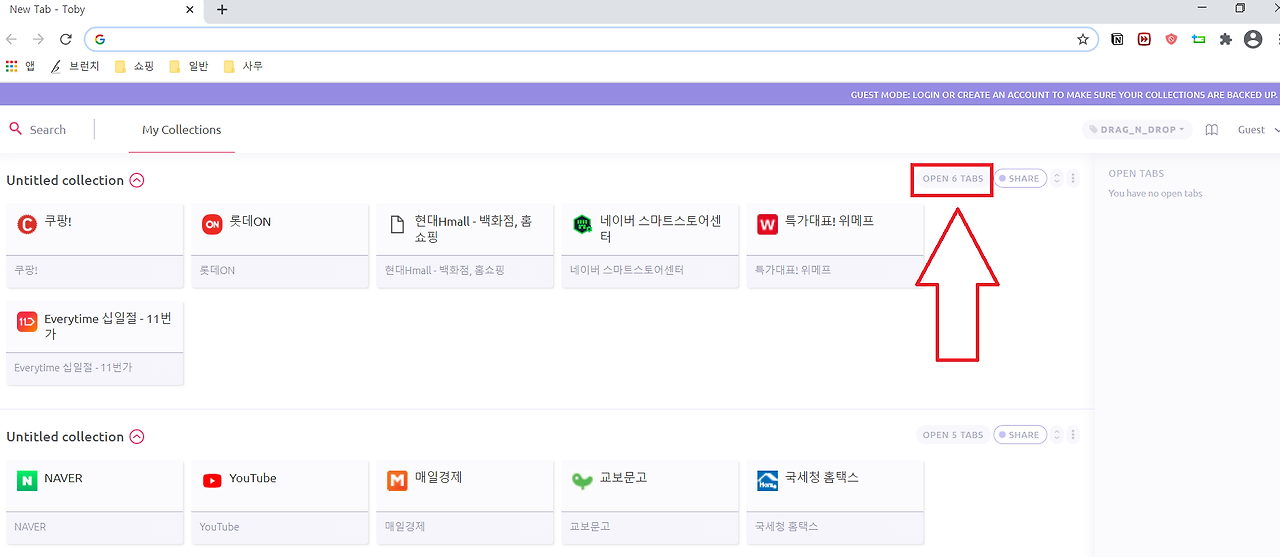 북마크 아이콘을 누르면 사이트가 자동으로 열립니다. 하지만 이게 다가 아닙니다! 위에 표시한 OPEN n TAPS를 누르면 첫 번째 카테고리에 있는 사이트들이 전부 열립니다! 20개의 사이트가 등록되어 있으면 20번의 클릭과 20번의 창을 열고 닫는 작업을 줄여줍니다. 직관적으로 북마크들을 볼 수 있어서 생산성이 한 번 높아졌고, 한꺼번에 사이트들을 오픈할 수 있기에 생산성이 두 번 높아집니다.
