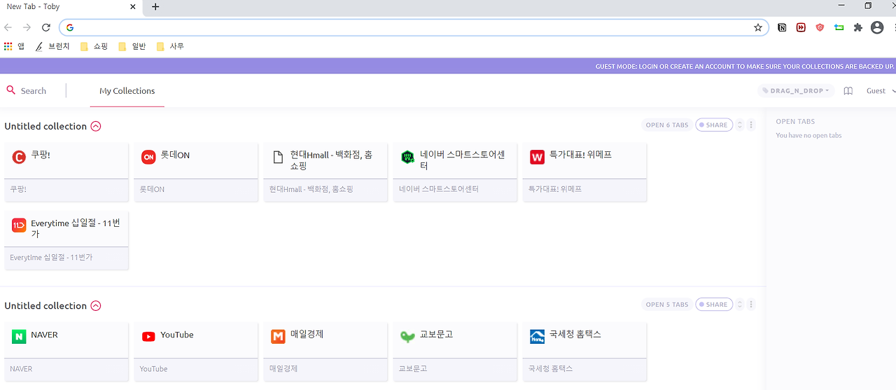 내게 필요한 사이트들만 딱 세팅되어 있는 상태를 원했습니다. 그래서 여기저기 찾아보다가 크롬 확장 프로그램 Toby를 발견했습니다. Toby는 직관적으로 북마크 사이트들을 한 화면에 모아주는 확장 프로그램입니다.