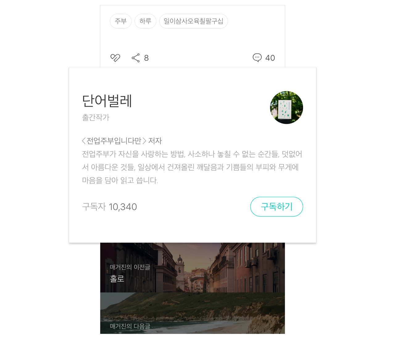 게시글을 다 읽고 난 뒤 보이는 작가 프로필은 한 장의 명함 같은 모습으로 더욱 깔끔하게 바뀌었습니다. 작가에 대한 정보를 한눈에 확인할 수 있는 것은 물론이고, 마음에 드는 작가를 발견했을 때 바로 구독도 할 수 있습니다. 또 PC에서는 작가에게 바로 제안을 보낼 수 있는 '제안하기' 버튼도 추가되었으니, 함께 협업해 보고 싶은 작가가 있다면 망설이지 말고 제안해 보는 건 어떨까요?