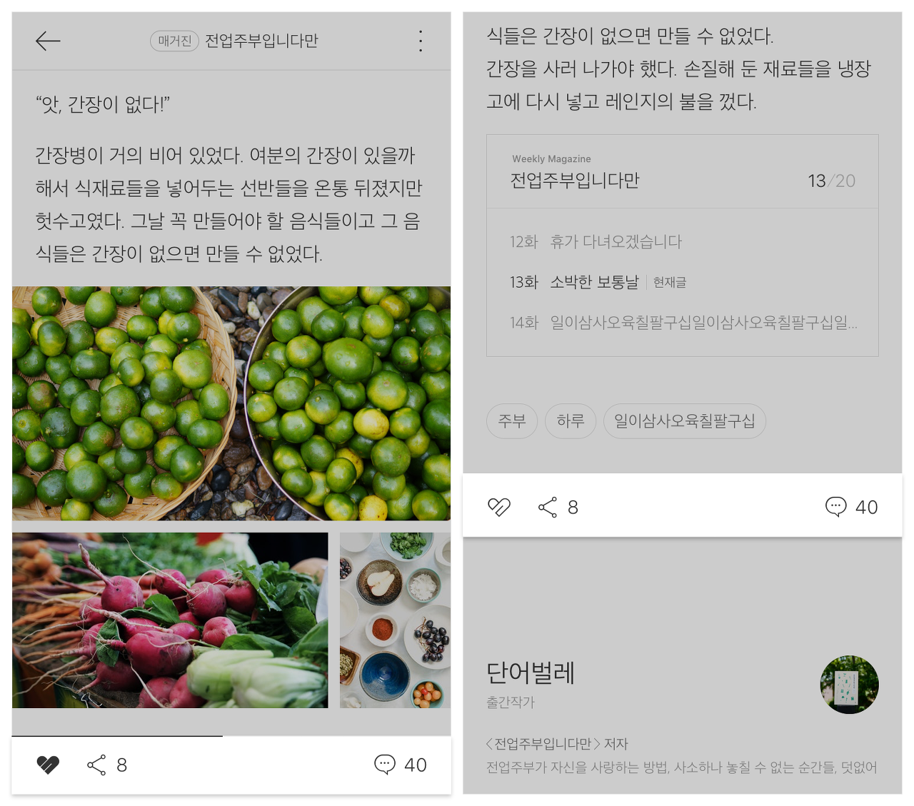 새로워진 게시글 화면에서는 독자가 글의 맥락을 이해하는데 도움을 줄 수 있도록 글이 속한 매거진을 더 강조했습니다. 언제든 게시글 상단 바에서 현재 읽고 있는 글이 담긴 매거진의 제목을 확인할 수 있습니다. 본문을 다 읽으면 이 글이 속한 매거진의 이전 글과 다음 글을 연이어 읽을 수 있습니다. 매거진의 첫 글이나 최신화를 읽고 싶다면, 상단 바에 표시되는 매거진 제목을 클릭해보세요!