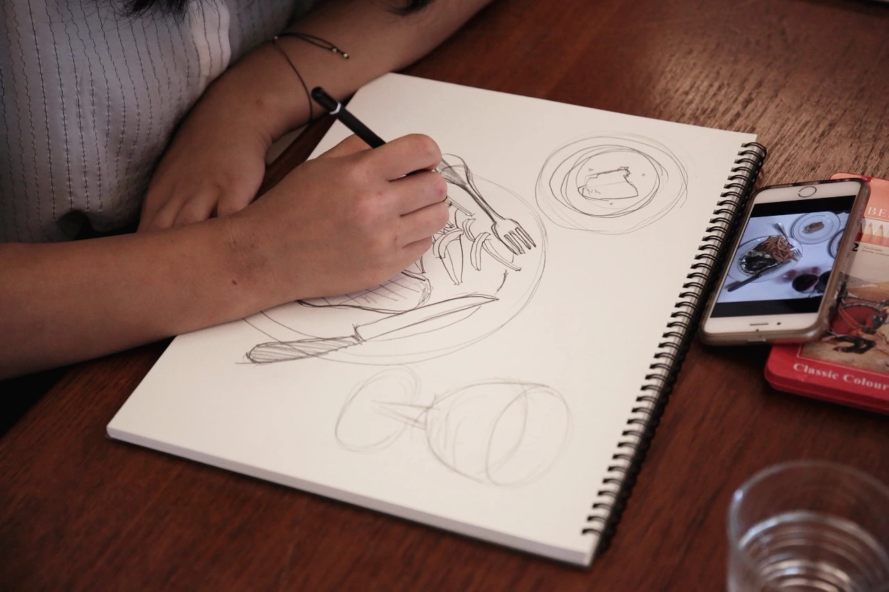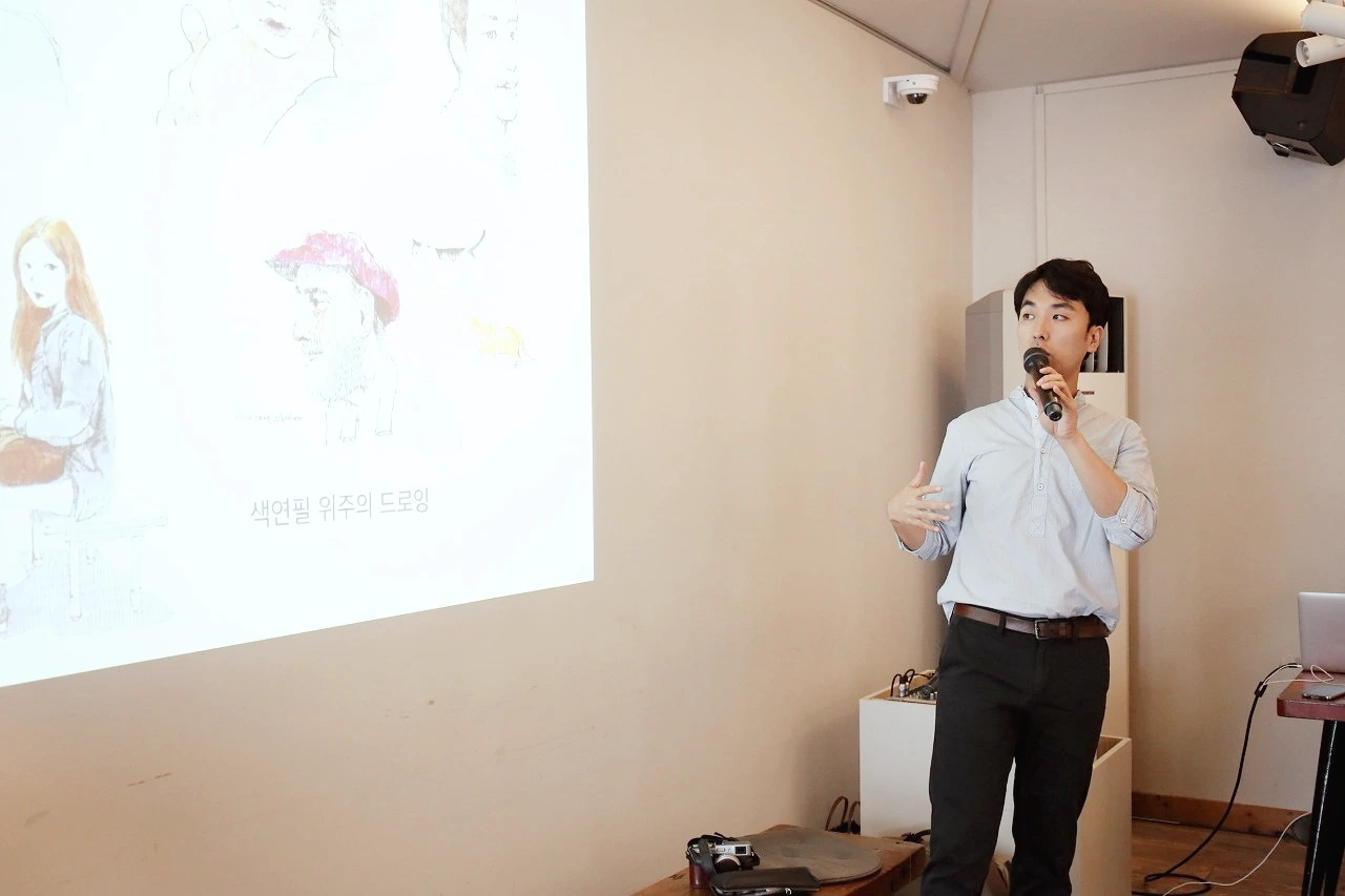 리모 작가님의 강연이 끝나고, 곧이어 원데이 드로잉 클래스가 이어졌습니다. 작가님께서는 먼저 연습 삼아 주변에 있는 사물이나 가방 속에 있는 아끼는 물건을 주제로 가볍게 시작해보자고 이야기하셨습니다. 참석하신 독자분들은 잠시 주변을 둘러보거나 자신의 가방 속 물건, 혹은 휴대폰 속 사진을 찾아보는 듯 싶더니 이내 스케치북에 연필로 쓱쓱 드로잉을 하기 시작했습니다. 참석한 대부분의 브런치 독자분들이 드로잉에 대한 관심이 많아서였는지 스케치를 하는 손길에는 조금의 머뭇거림도 없었습니다. 리모 작가님은 "그동안 꽤 많은 드로잉 수업을 진행했는데, 이렇게 수준 높은 클래스는 처음이네요."라는 말로 참석자들의 실력을 칭찬하셨습니다.