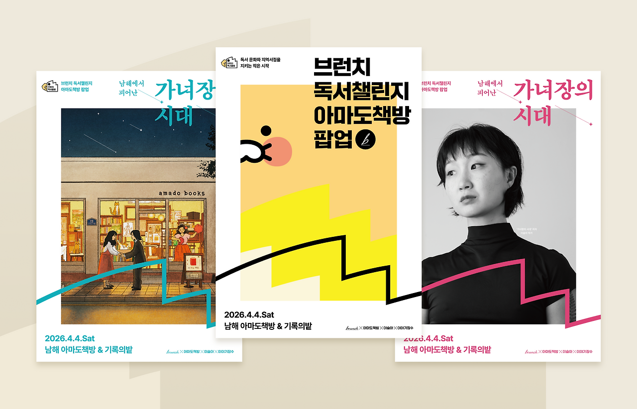 4월 4일(토), 브런치 독서챌린지의 첫 번째 지역서점인 경남 남해 아마도책방에서 ‘브런치 x 아마도책방 x 이슬아 x 이야기장수’ 독서챌린지 일일 팝업이 열립니다. 따스한 남해의 봄날, 브런치 독서챌린지와 함께 더욱 특별해진 『가녀장의 시대』를 아마도책방에서 만나 보세요.