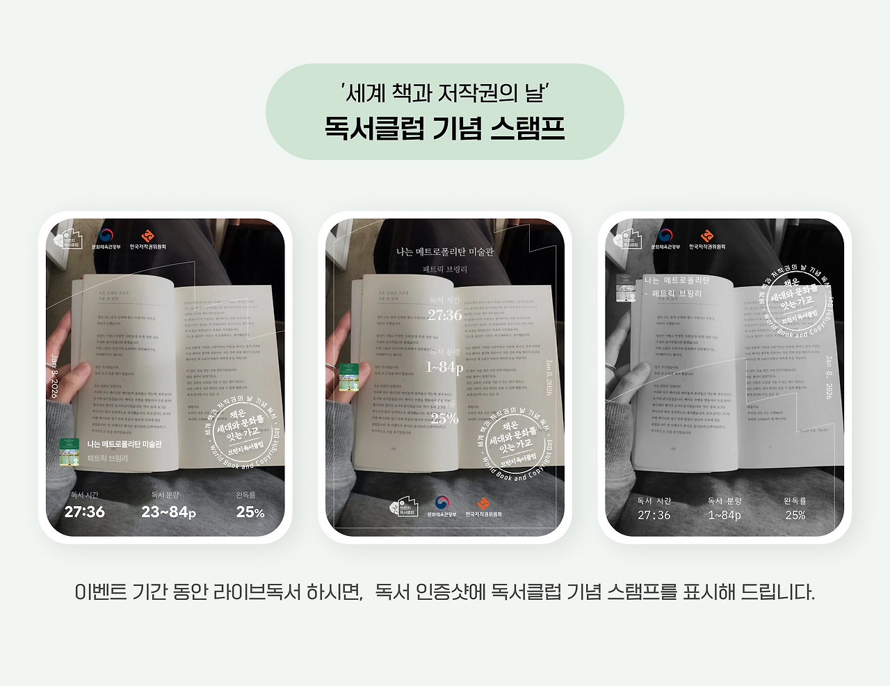 이벤트 기간 동안 라이브독서 하시면, 독서 인증샷을 남길 때 자동으로 '세계 책과 저작권의 날' 독서클럽 기념 스탬프를 표시해 드립니다.