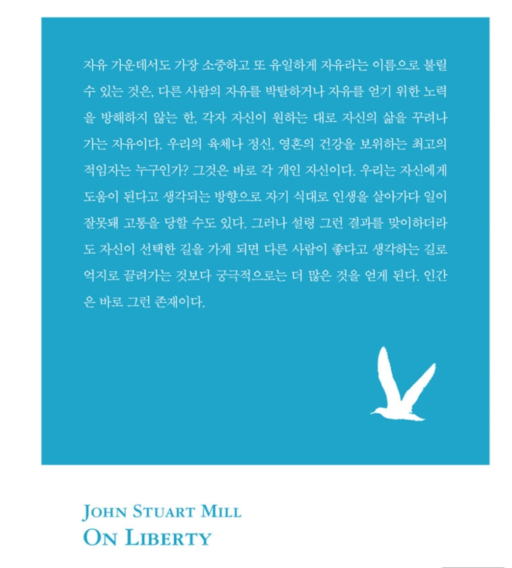 일단 밀은 이상주의자였다는 생각이 듭니다. 그 시대 높은 수준의 지식인이 많이 없었던 가운데 이런 글을 쓰기까지 시대에 대한 안타까움과 동시대 사람들의 무지한 삶의 방식에 대한 답답함이 얼마나 가슴을 찔렀을지 생각해 봅니다. 결국 글을 쓴다는 것은 자신의 생각을 타인에게 나누고 전하고 싶은데 대화나 설득으로는 해결을 볼 수 없을 때 하나의 탈출구로 사용되는 것이 아닌가 합니다. 이 책을 관통하는 주제로 ‘다른 사람의 행동의 자유를 침해할 수 있는 경우는 오직 한 가지, 자기 보호를 위해 필요할 때 뿐이다’라고 거듭 반복되는 밀의 문장을 보며 ‘얼마나 많이 이 사람의 자유가 침해받았었기에 이렇게 글을 써서 사람들을 설득하고 가르치려고 했을까’라는 생각이 들었습니다. 이렇게 가르칠 필요를 강하게 느꼈기에 자유론을 쓴 것이겠지요.