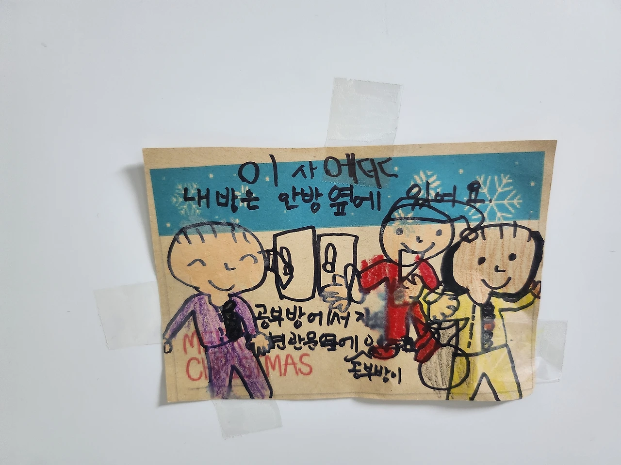 "산타할아버지.. 아니 산타 할머니가 올 수도 있으니까.. 아무튼 산타님... 제가 앞으로는 진짜 동생한테 친절하게 대하고 엄마 아빠 말도 잘 들을 테니까 꼭 우리 집에 와주세요.. 제가 제일 아끼는 간식도 트리 밑에 뒀어요... 그거 꼭 드시고요.. 그리구 우리 앞집에는 애가 세 명이나 있는데 셋 다 착해요... 그 집 가는 김에 우리 집도 꼭 들러주세요."