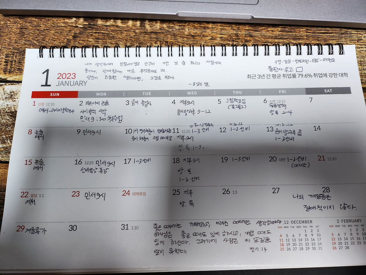 일일 계획을 적고 나서도 달력에 빈틈이 생기니 슬금슬금 정신 무장용 명언들을 적기 시작했다. 그래, 이런 명언을 읽으면 마음에 힘이 생기니까... 하면서 결국 달력을 빽빽하게 채웠다.