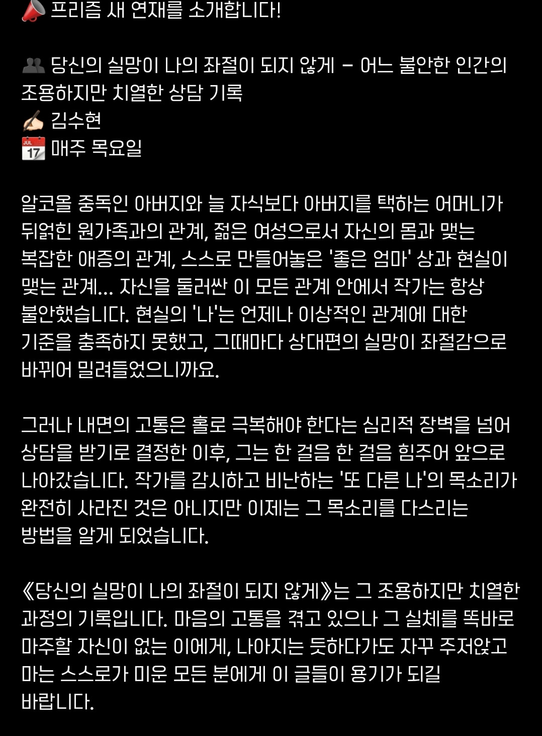 오늘부터 매주 목요일, 북이오 출판사에서 운영하는 [프리즘] 채널에서 연재 후 전자책 에디션으로 발간 예정입니다.