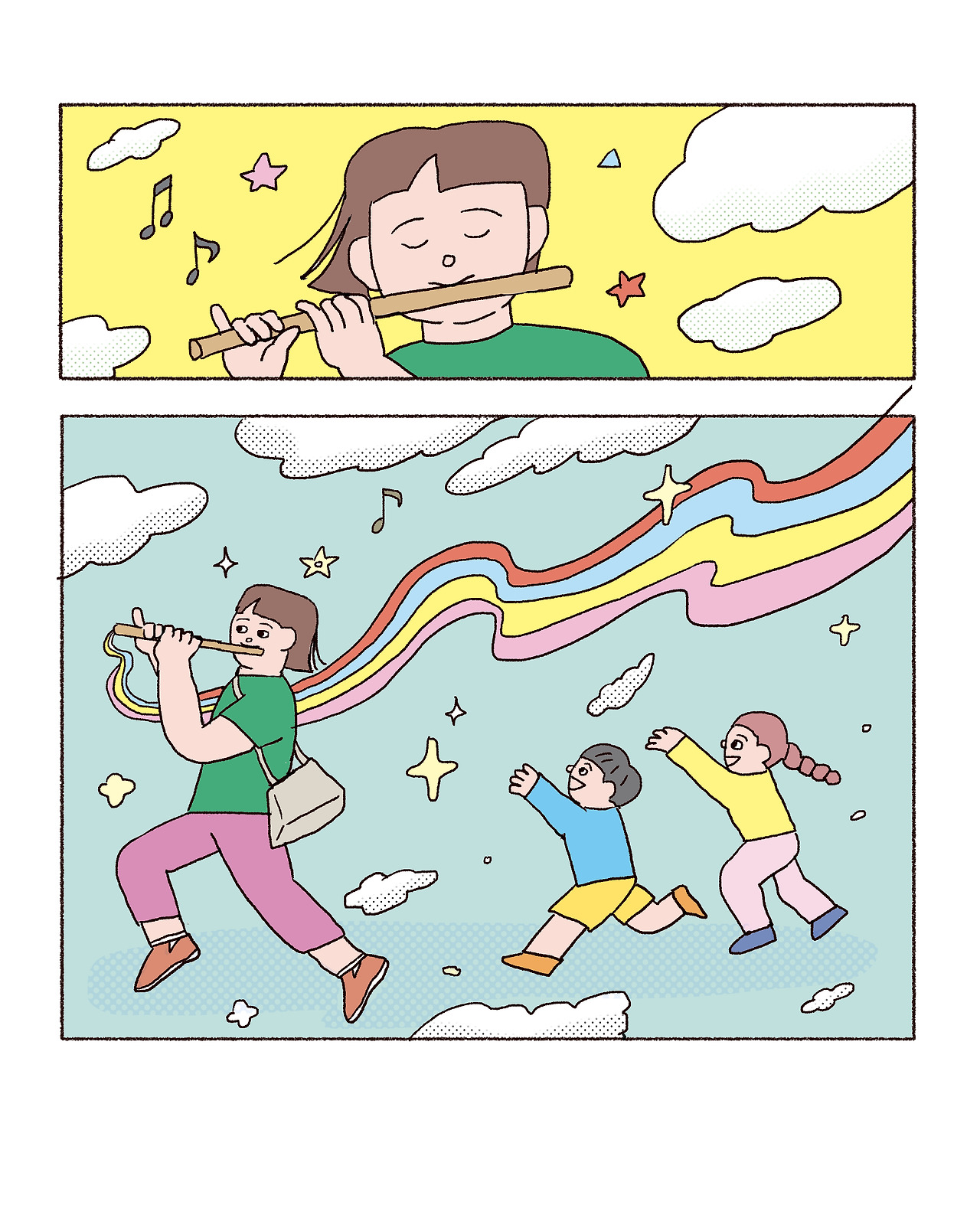 어떤 어린이와도 어려움 없이 대화하고 있다면 당신 몸속엔 당신도 모르는 무지개 피리가 삘릴리 삘릴리 소리를 내고 있는 건지도 모름. 당신도 모르는 사이에 ‘하망동 피리 부는 아줌마 떴다’하고 아이들이 달려 나오고 있을지도.