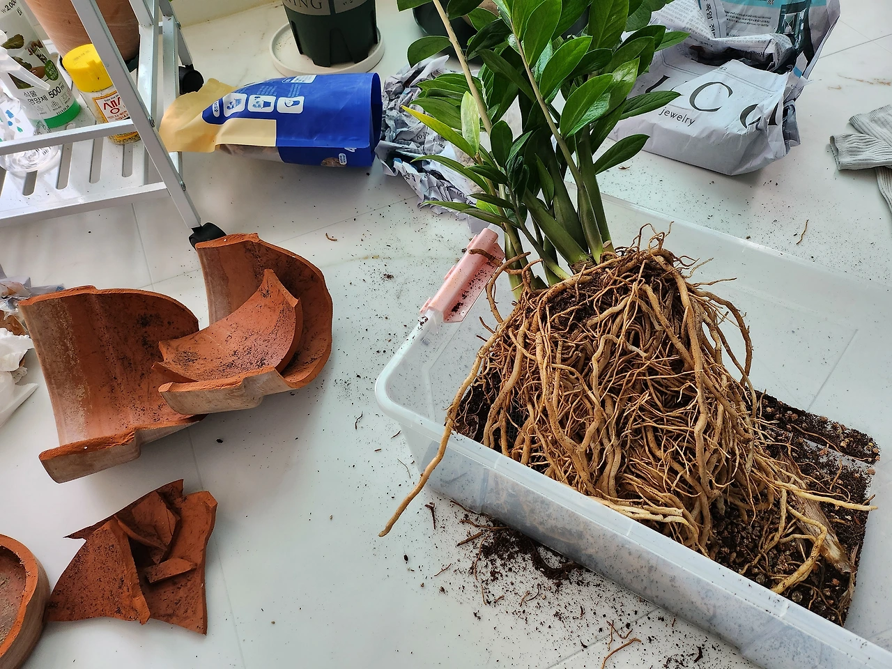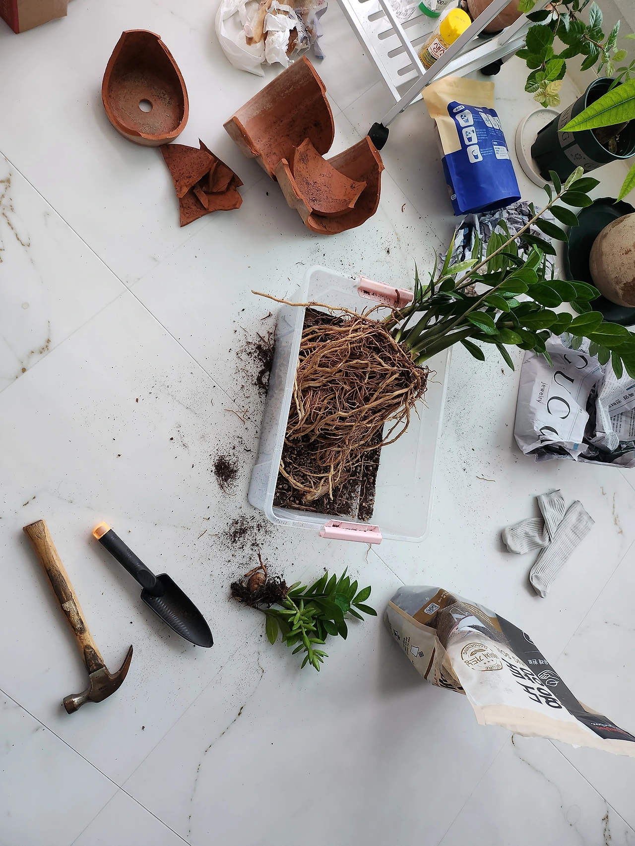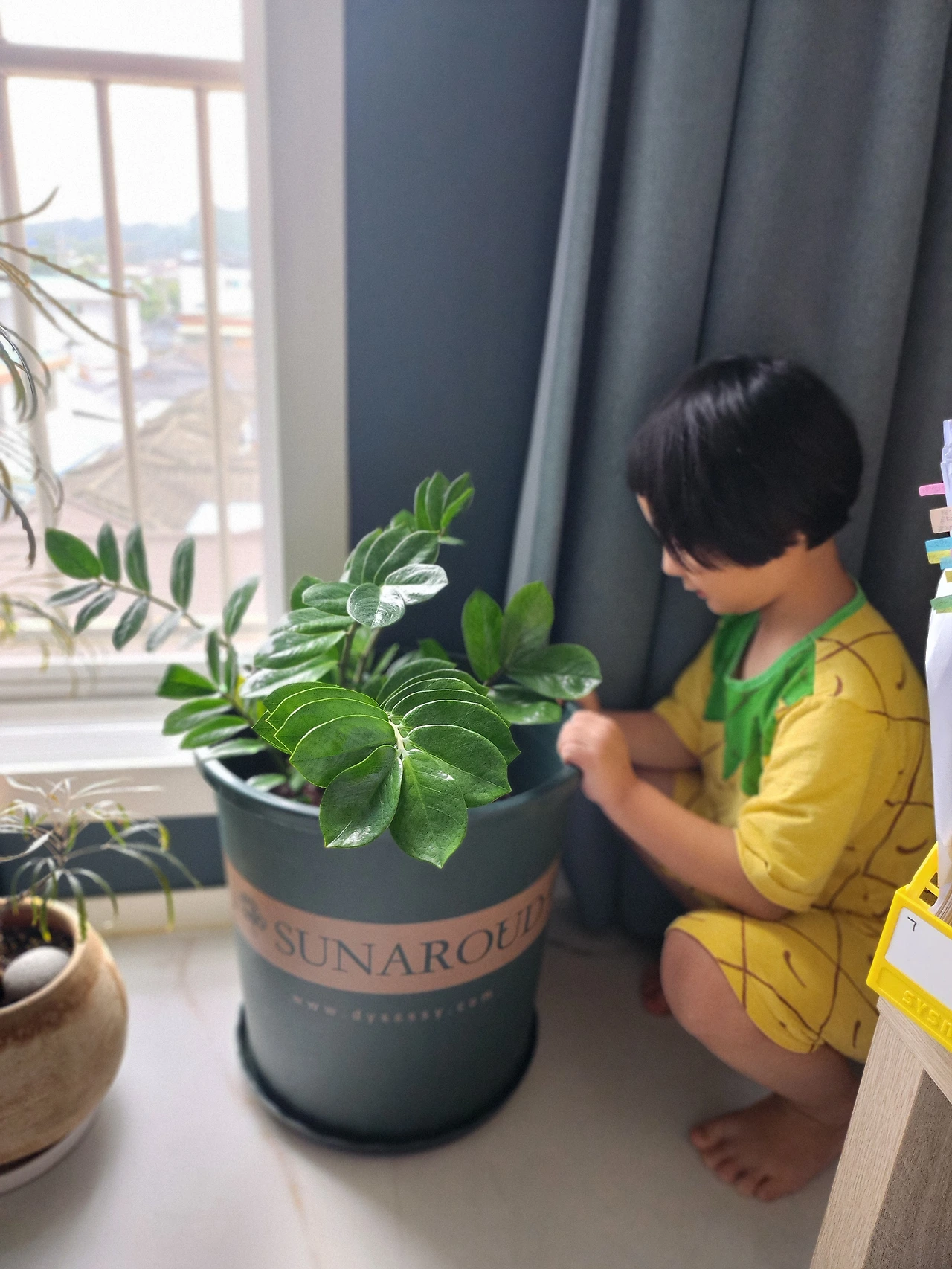 결국 실용적이기만 하고 김장할때 쓰는 고무다라이만큼 큰 플분에 금전수를 심었다. 코코칩 섞은 배양토가 20리터 통으로 들어갔다!!! 세상에.