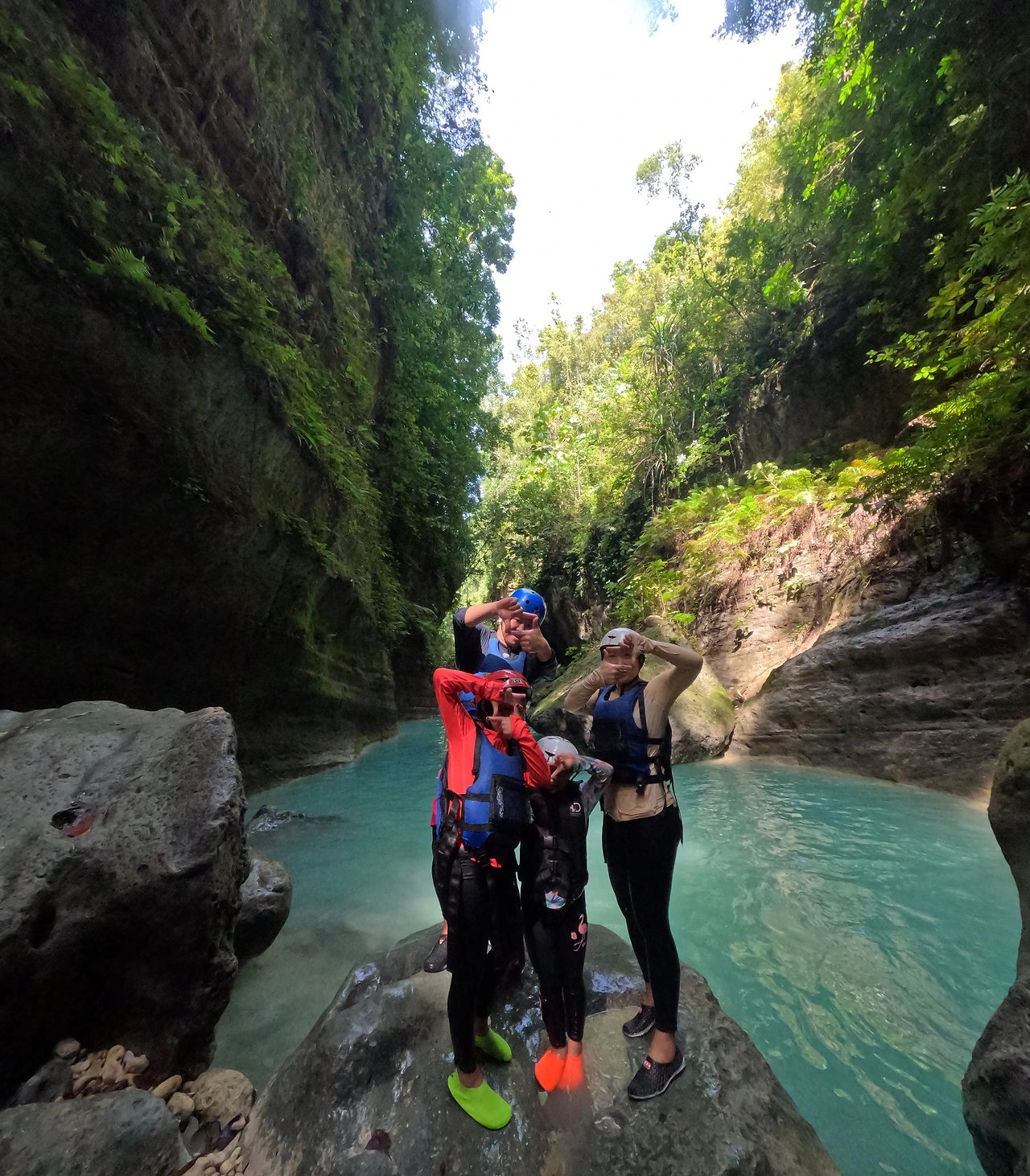 나는 고소공포증이 있는지라 절벽에서 과연 뛸 수 있을까, 못 뛰면 다른 길로 돌아가야 하지 않을까, 정 안되면 안 뛰어야지 생각하고 갔다. 그런데 가와산 캐녀닝은 가이드가 무조건 멱사리 잡고 끌고 가는 시스템이었다. 안 뛰고 돌아가고 그런 게 일절 불가능. 안 되면 가이드한테 안겨서라도 점프해야 한다.