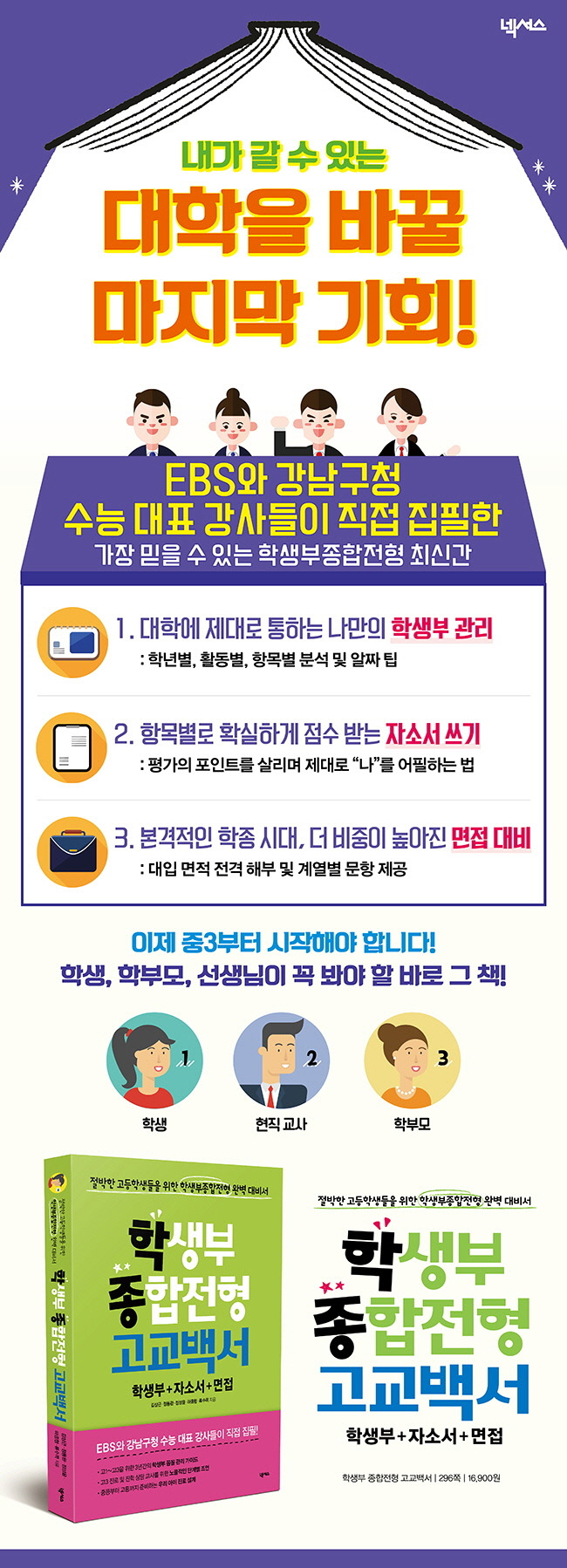 요즘 대세로 거듭나고 있는 학생부 종합전형에 대한 모든 것을 담으려 저와 4분의 명인들을 모시고 지난 7개월간 심혈을 기울인 원고거든요.