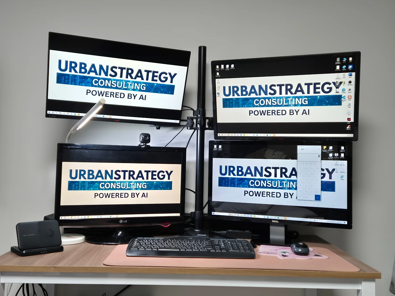 아침에 책상 앞에 앉으면 제일 먼저 하는 일이 있다. 4개의 모니터를 켜는 것. 부팅음이 순차적으로 울리고, 내 회사 "URBANSTRATEGY CONSULTING POWERED BY AI"라는 로고가 네 곳에서 동시에 떠오른다. 이 순간, 나는 준비가 된다.