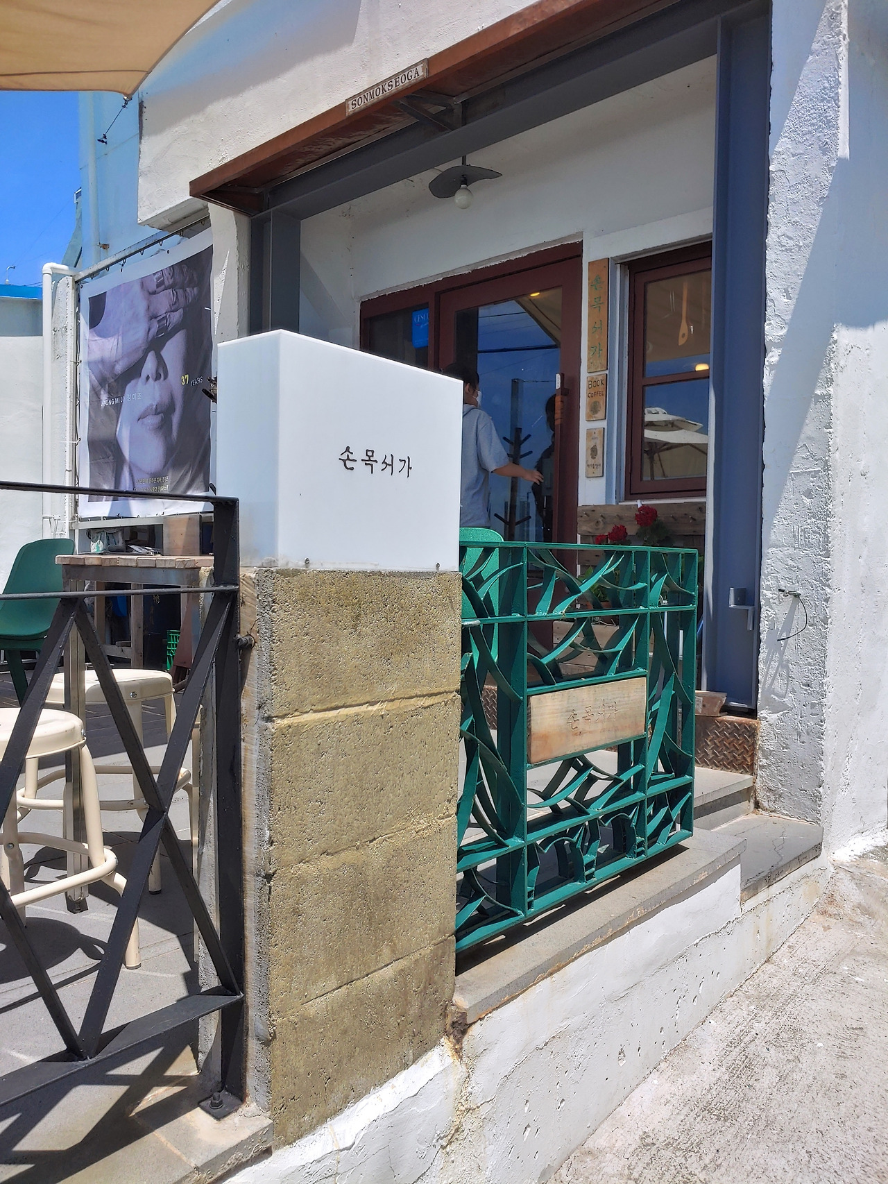 날씨가 더워서 그런지 일요일 오전 흰여울 마을 주차장은 한산했다. 차를 세우니 주차요원이 오토바이를 타고 달려와 차 유리창에 주차권을 꽂았다. 주차 후 바다 산책로를 따라 걷기 시작했다. 바닷가 바람이 내 몸을 어루만져 주긴 했지만 내리쬐는 땡볕에 온몸은 땀으로 흠뻑 젖기 시작했다. 그렇게 햇볕에 노출된 해안 산책길을 10여분 정도를 걸어갔다. 정말 바다 말고는 아무것도 없었다. 다른 날이었다면 정말 안구가 정화되는 길이 었겠지만 한 여름에는 그냥 에어컨이 간절해지는 그런 길이었다. 서점을 찾기도 전에 지쳐버릴 것만 같았다. 지쳐 갈 때쯤 왼쪽에 흰여울 마을로 올라가는 계단이 나타났고 그 계단을 보는 순간 또 한 번 한숨이 터져 나왔다. 뭔 놈의 계단이 그리 많은지. 이것 또한 물론 다른 계절이었다면 그렇게 많은 계단은 아니었겠지만 말이다. 꾸역꾸역 계단을 올라 오른쪽으로 50미터 정도 걸어가니 드디어 첫 번째 목적지를 발견할 수 있었다.