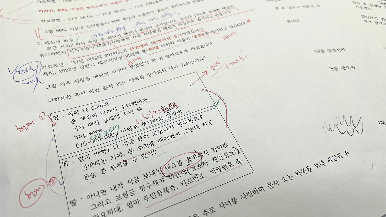 보이스피싱은 종류가 상당히 많다. 그중 5분 정도 길이의 영상을 통해 홍보 효과를 보려면 어떤 주제를 골라야 할지 고민되었다. 그러다 최근 60대 이상이 가장 많이 당하는 두 가지 주제가 떠올랐다. 첫 번째는 “엄마 뭐해?” 또는 “엄마 바빠?”로 시작하는 ‘메신저 피싱’이다. 두 번째는 “해외결제 95만원” 등 구매하지도 않았는데 구매했다는 문자가 오는 ‘결제스미싱’이다. 주제가 정해지자 시나리오 작성은 수월하게 진행되었다. 늘 해오던 강의였기 때문이다.(사진 :화면중 문자메시지, 결제스미싱)