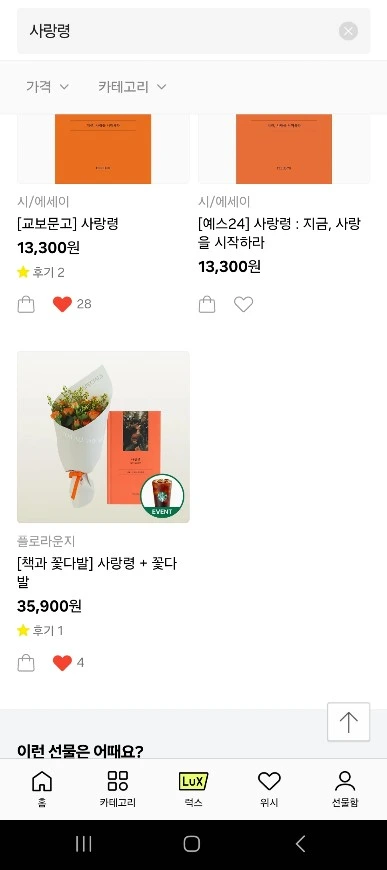 카카오 선물하기에서 사랑령을 검색하면 꽃과+책을 선물할 수 있다.