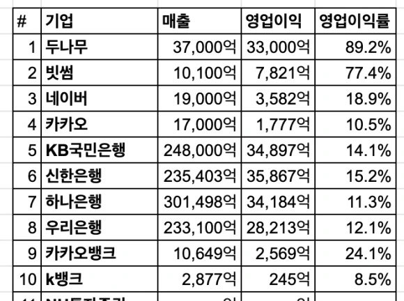 우선, 두나무의 성장세가 무섭습니다. 영업이익만 놓고보면 주요 4대은행의 규모에 육박합니다.