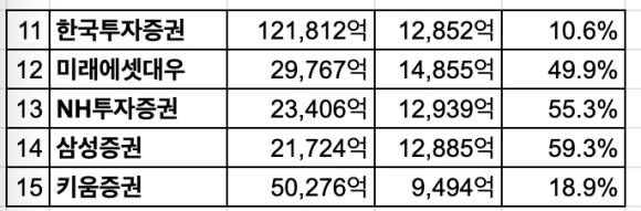 매출 기준으로는 한국투자증권이 독보적입니다. 12조의 매출을 달성했습니다. 그 뒤로 미래에셋대우가 거의 3조원의 매출을 올렸고, NH투자증권은 2.3조, 삼섬증권이 2.1조, 키움증권이 MTS의 영향인지 매출이 5조원이나 됩니다. 영업이익은 제일 낮지만요.