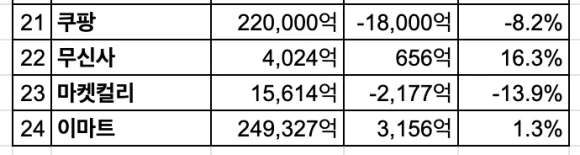 정말 마지막 덤으로, 요즘 핫한 스타트업 유니콘들인 쿠팡, 무신사, 마켓컬리 + 비교를 위한 이마트까지 매출 영업이익을 노트해놓습니다.