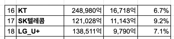 매출과 영업이익 모두 KT가 1위입니다. 2.5조 매출에 1.7조 여업이익이고, 영업이익률은 6.7%정도됩니다. 그다음으로 SKT는 매출이 1.2조, 영업이익이 1.1조, 영업이익률이 9.2%로 가장 높습니다. 마지막으로 엘지유플러스는 매출 1.4조 영업이익 98백억 정도이고, 영업이익률이 7.1%입니다.