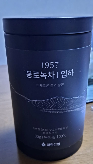 새로 산 녹차는 우리나라 대한다업에서 나온 '봉로녹차/입하'라는 차이다. 찾아보니, 오설록뿐 아니라 국내에도 여러 업체에서 녹차를 생산 가공 판매하고 있었다. 검은 둥근 캔의 포장이 나쁘지 않다. 1957이라는 숫자를 보아하니 대한다업은 1957년부터 차를 만들어 왔음을 짐작할 수 있다. 부제로 '다채로운 봄의 향연'이라 붙어 있다. 상품명과 부제 그리고 '다양한 형태의 찻잎과 맛을 지닌 봄을 모은 차'라는 설명을 참고하여 짐작하건대, 입하(양력 어린이날 즈음) 전후로 수확한 차 잎인 듯하다. 물에 젖어 펼쳐진 잎을 보아하니 뾰족한 움(창)은 간혹 있고 주로 작은 잎들이다. 아름답게 표현하였지만 과장이나 거짓은 없어 보였다. 이것만으로도 대한다업과 거기서 생산된 차가 진실되다는 인상을 받는다.