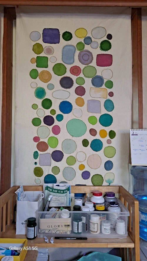 그걸 가져와 바탕 작업을 하는데 또 며칠이 걸렸다. 아교포수를 하고 널었다. 광목천이 두꺼워 마르는데 시간이 좀 걸렸다. 어떻게 그릴까. 무슨 물감으로 칠할까 어떻게 칠할까, 이런저런 생각을 하고, 이일 저일, 심난한 일, 명절을 보내니 또 한 달이 훅 지나갔다. 그리고는 파스텔로 밑그림을 그렸다. 녹황색 파스텔인데 전체적인 그림 분위기에 꼭 맞는 색상으로 모양의 테두리가 그려졌다. 작업 초기에 이런 느낌은 왠지 이 작업이 잘 나올 거라는 기대감을 상승시킨다. 앗. 파스텔로 본을 먼저 그리고 아교포수를 했다. 그래야 본이 지워지지 않을 거 같다는 생각에서였다. 그리고 아교포수를 붓으로 하지 않고 분무기로 했다. 처음 해보는 거라 반신반의 실패할 확률이 높았지만 해보았다. 그렇게 해서 말려두고 또 2주가 지났다. 그리고 어제 드디어 채색에 들어갔다. 아교포수가 아무래도 약했는지 물을 많이 섞은 물감은 번지는 곳이 좀 있었지만, 그런대로 자연스럽게 놔두기로 했다. 바탕은 천의 색이 아이보리, 베이지 색 중간이어서 작품이면 모르겠지만, 커튼으로 사용할 거라 바탕은 칠하지 않기로 했다. 매끈한 광목이 아니고 우둘두둘한 광목이어서 채색이 더디다. 그러나 느낌이 좋다. 종이에 마커 작업, 한지에 먹, 순지에 분채 채색 이런 것들과 작업하면 기분이 좋아진다. 바탕지의 느낌과 그것에 안료가 스며들때의 속삭이는 듯한 소리. 작가마다 작업할 때 좋은 느낌의 재료가 있다. 이것도 작가의 에너지와 재료의 에너지가 잘 공명하기 때문이라고 추측해 본다.