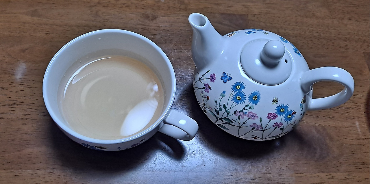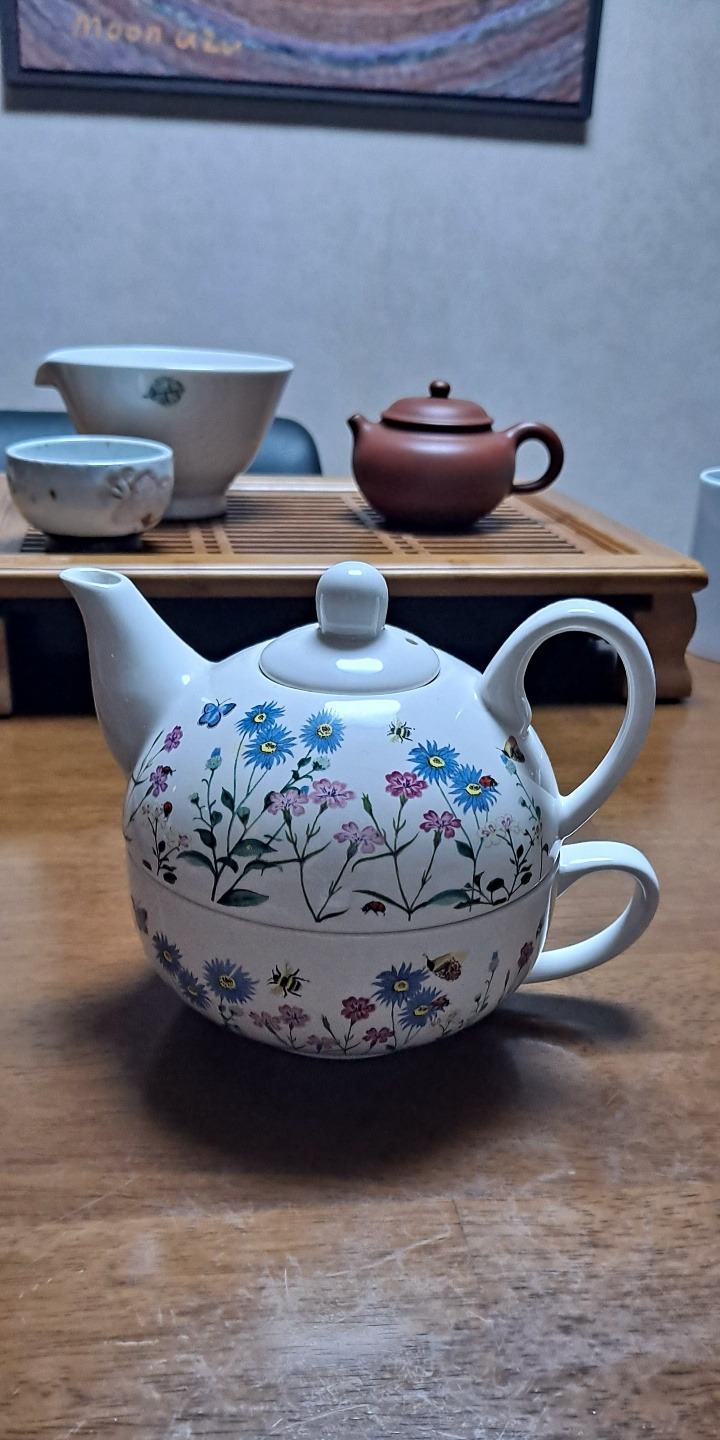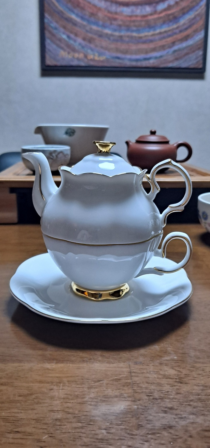 위에 티팟과 아래 찻잔으로 구성된 이단 세트이다. 아래는 찻잔용이라고 하나 대접처럼 너무 넓어서 여기에 차를 마시면 쉽게 식어서 찻잔으로 사용하지 않는다. 대신 뜨거운 물을 담고 그 위에 티팟을 올려놓아 워머 용도로 사용한다. 한편 둘째에게 선물한 일인용 티팟은 공주 스타일이다.