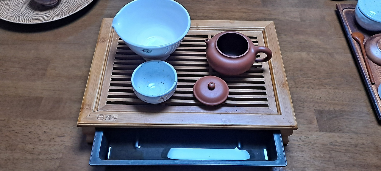 대나무 퇴수기에는 물받이 서랍이 있어 첫 탕을 쟁반 위에 그냥 버릴 수 있다.