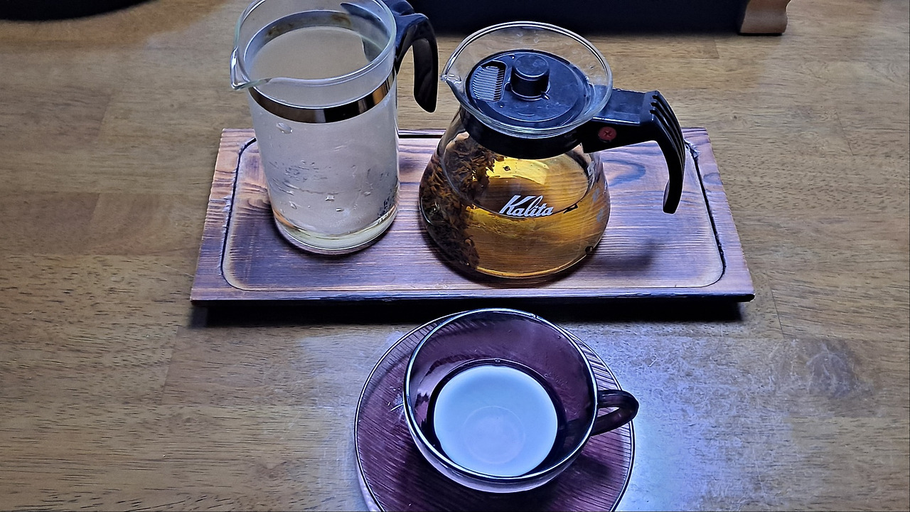 직사각형의 나무 다반에 커피 내릴 때 사용하는 Kalita 유리 주전자를 다관(tea pot)으로, 대만산 티팟인데 뚜껑과 차 거름방을 제거하고 숙우처럼 사용한다. 첫탕 퇴수는 주방에서 미리 해온다. 다구의 운치는 없지만 홍차를 혼자 마실 때는 이 구성이 가장 편하다. 손님이 많을 때는 워머 위에 올려놓고 사용하는 800cc, 1000cc짜리 유리 티팟이 적절하다. 멋진 일인용 홍차 티팟세트도 있다. 예쁜 게 많아서 전부 사고 싶지만, 두 개 정도 구입했다.