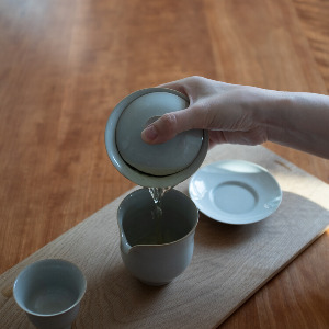 유리 다관에서 차 거름망 건져내기한편 다관을 검색하다 보면 개완이라는 특별한 다기를 발견한다. 대개 도자기로 되어 있고 큰 찻잔 같아 보이는데 뚜껑이 있다. 찻잔처럼 잔 받침도 있다. 뚜껑 있는 찻잔이어서 개완盖椀이라 불린다. 그런데 개완은 차를 우리는 다관의 기능을 한다. 차 잎을 넣고 우려내는데, 뚜껑과 몸체 안쪽에 미세한 홈이 있어 그곳으로 차를 따른다. 또는 뚜껑을 살짝 비껴 열어 작은 틈으로 차를 따른다. 혼자서 차 마시기에 적당하다. 뭔가 특별해 보여서 장만해 보았다. 개완만 판매하기도 하고, 개완과 숙우, 찻잔을 한 세트로 판매하기도 한다. 개완만 구입하는 경우에는 숙우가 구비되어 있어야 편하다. 그러나 차를 우리는 도중 개완 몸체가 뜨거워져 손으로 잡기 어렵다. 게다가 차 잎이 쏟아지지 않도록 뚜껑을 조절하는 것도 쉽지 않다. 내가 구입한 것은 새의 주둥이 같이 작은 홈이 있어 뚜껑을 조절하지 않아도 되지만 몸체가 뜨거운 것은 어쩔 수 없다. 요즘에는 개완의 몸체도 나무 조각을 붙여 손이 데지 않도록 배려한 것들이 출시된다.