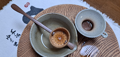 이렇게 정리하고 보니 내가 마셔본 차는 빙산의 일각이었다. 동시에 차를 맛볼 무궁한 세계가 눈앞에 펼쳐졌다. 오랜만엔 개완을 꺼내고, 연밥 거름망, 도자기 차루를 꺼내 녹차를 음미했다. 앗! 연밥거름망에서 연밥의 쾌쾌한 냄새가 우러나와 차 맛을 망쳤다. 물의 미세한 차이도 차 맛을 다르게 한다는데. 그러므로 연밥 차루는 비추한다. 대신 손잡이가 있는 도자기 차루를 추천한다. 도자기 차루의 받침이 없다면 여분의 찻잔 위에 걸쳐놓고 사용하면 좋다. 멋은 없지만 가장 실용적인 거름망은 뭐니 뭐니 해도 손잡이가 달린 스테인리스 거름망이다.
