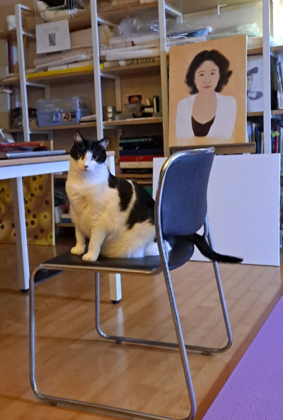 몇 달째 매달려 그리던 자화상을 바닥에 세워놓았는데, 깜지가 그림 앞에서 열심히 쳐다보더니 갑자기 그림 속 내 볼에 뽀뽀를 했다. 평소 나에게 하듯. (참고로 깜지의 뽀뽀는 아주 기분 좋을 때 나한테만 하는 걸로 아주 비싸다.) 사진을 찍으려던 순간 벌써 눈치 채고 자리를 떴다. 도대체 인증 사진을 남길 수 없다. 암튼 엄마를 거짓말쟁이로 만들기로 작정을 했다.