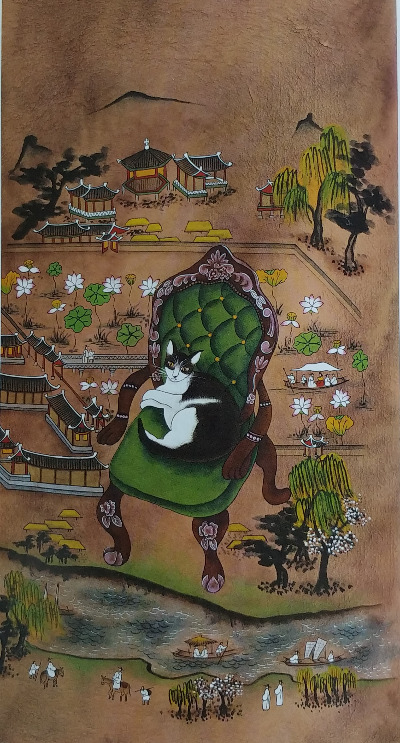 내가 그림을 시작하던 해, 깜지도 우리 집에 왔다. 그때는 그냥 그런가 보다 했는데, 시간이 지날수록 이게 우연이 아닌 듯하다. 깜지는 내가 그림 그리는 걸 좋아한다. 그림 그리려고 종이를 펼치고 들썩이고 하면 신이 난다. 아이들도 없는 이 집에서 움직이는 건 나밖에 없으니. 내가 나비가 되고 쥐가 된다. 깜지는 특히 우리 전통 종이 순지를 좋아한다. 비단처럼 고운 순지를 그림 그리려고 펼쳐놓으면 날름 올라가 철퍼덕 앉는다. 그리고 한동안 절대 움직이지 않는다. 그럼 시큰둥해질 때까지 관심 없는 척 다른 일 하며 기다려야 한다.