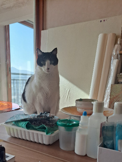 또 깜지는 유달리 붓을 빤 물감이 희석된 물을 좋아한다. 깜지가 좋아하는 건 웬만하면 다 해주고 싶지만, 물감에 카드뮴이든 주사든 독성 성분이 있는 안료도 있기에 그것 만은 막지 않을 수 없다. 얼른 깨끗한 물로 갈아 준다. 자기 물그릇의 물은 먹지 않으면서 꼭 책상 위에 올라와 그림 그리는 물통의 물을 먹는다.