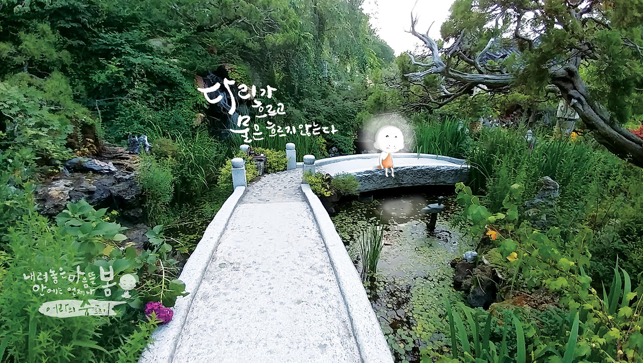 다리 위에 잠시 쉬면서, 이제는 다리는 멈추고, 물은 흐르는 곳에 나를 비추어 봅니다.