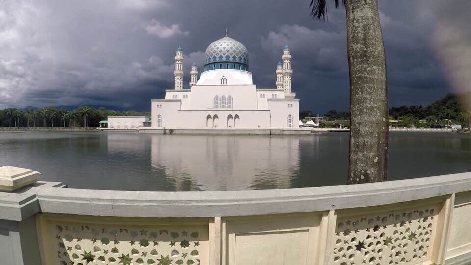 모스크 위로 펼쳐진 시커먼 먹구름 반쪽과 파란 하늘 반쪽,