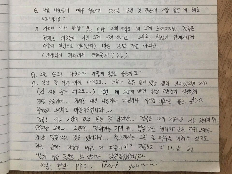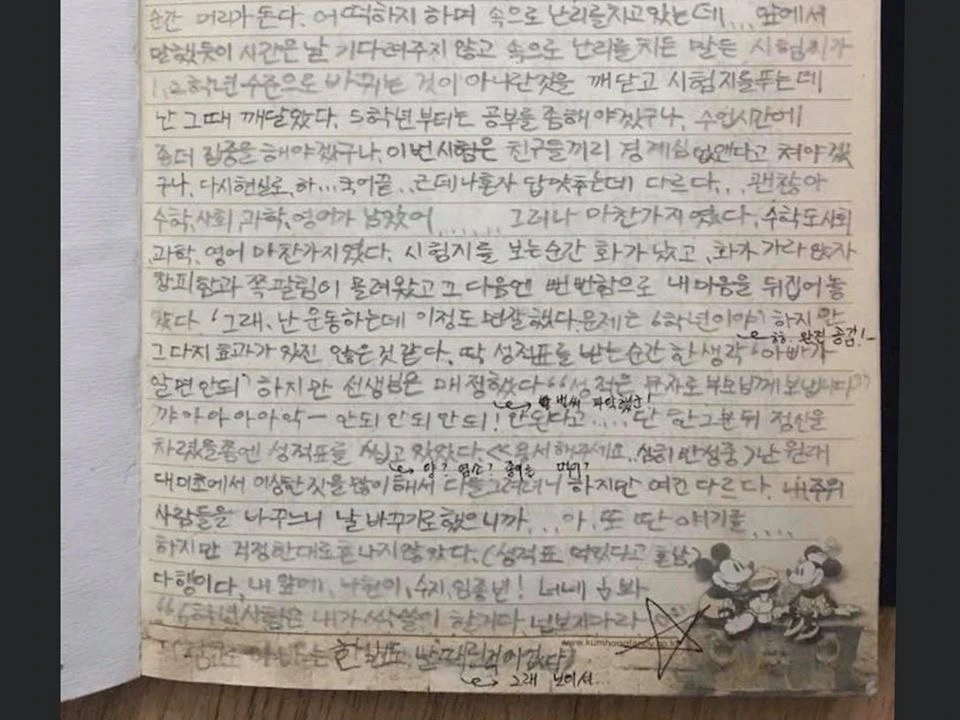 그 심정이 일기장에 적혀있었고 선생님은 위로하는 답을 달았다.