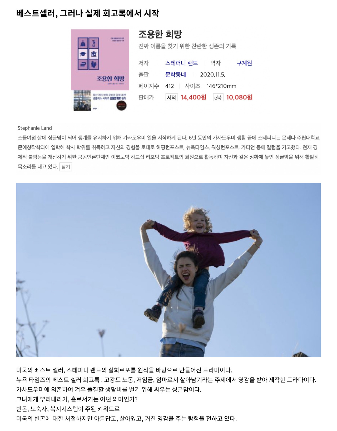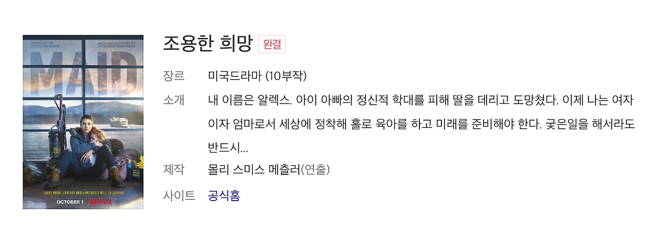 (이 드라마는 실화를 바탕으로하였고 우리나라에도 출판된 ‘조용한 희망’을 원작으로 합니다. 또 딸 알렉스 역할을 맡은 마가렛 퀄리와 엄마 폴리역을 맡은 앤디 맥도웰은 실재로 모녀지간입니다)