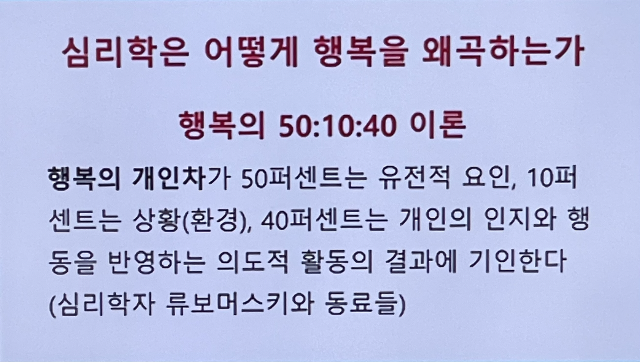 현재 우리나라의 종교와 정치, 경제와 교육에서조차 행복의 차이가 생기는 것을 개인차 문제로 돌리며 이미 정해진 유전자와 미미한 환경 상황은 무시하고 나머지 40%를 좌우하는 개인의 의지와 감정관리 개인의 능력에 달린 문제로 왜곡시킨다는 것이다.