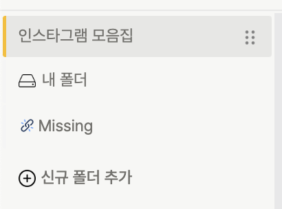 여기서 폴더를 추가하면 무조건 상단으로 올라가게 되어 있는데요 마우스를 해당 폴더에 가져다 대면 위 아래로 옮길수 있는 아이콘이 나타납니다.