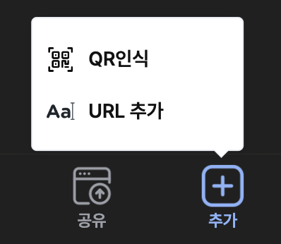 제일 하단에 있는 "URL 추가"는 기존에 저희가 다루었던 일반 URL 추가 방식의 URL 주소를 붙여넣기 하시면 추가 되는 방식이고 저희는 이번에 QR 코드를 인식 해야 하니 상단에 있는 "QR 인식" 을 선택 해주시면 됩니다.