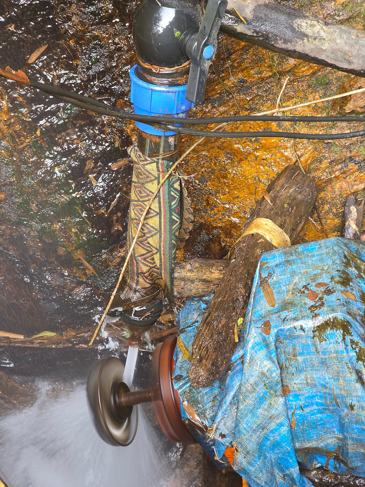 폭포물을 고무호스로 끌어와 낙차를 이용, 수력발전을 하고 있다.