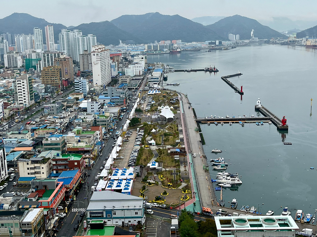 이상 기후로 인해 국화가 개화하지도 않은 건 차치하고서라도, 우선 그쪽에는 국화가 거의 없다. 국화축제에 국화가 없다니 뭔 말이냐 하겠지만, 실제 합포수변공원에 설치된 국화는 위에서 내려다본 첫 사진에서 가까운 쪽에 보이는 저게 전부다. 정말 무성의하기 짝이 없다.