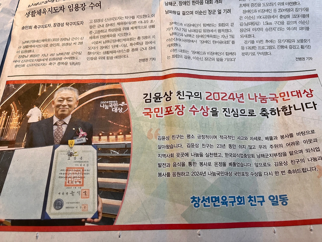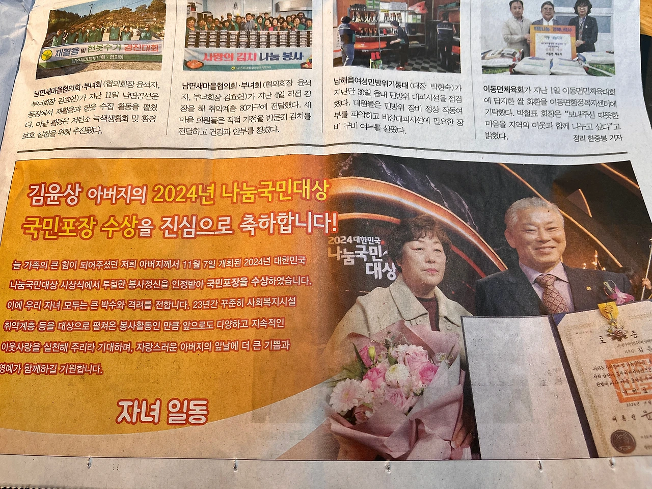"부족한 제가 과분하게도 자랑스러운 안남인상을 받았습니다. 면민 여러분 감사합니다! -이장협의회 제판권 회장 드림"