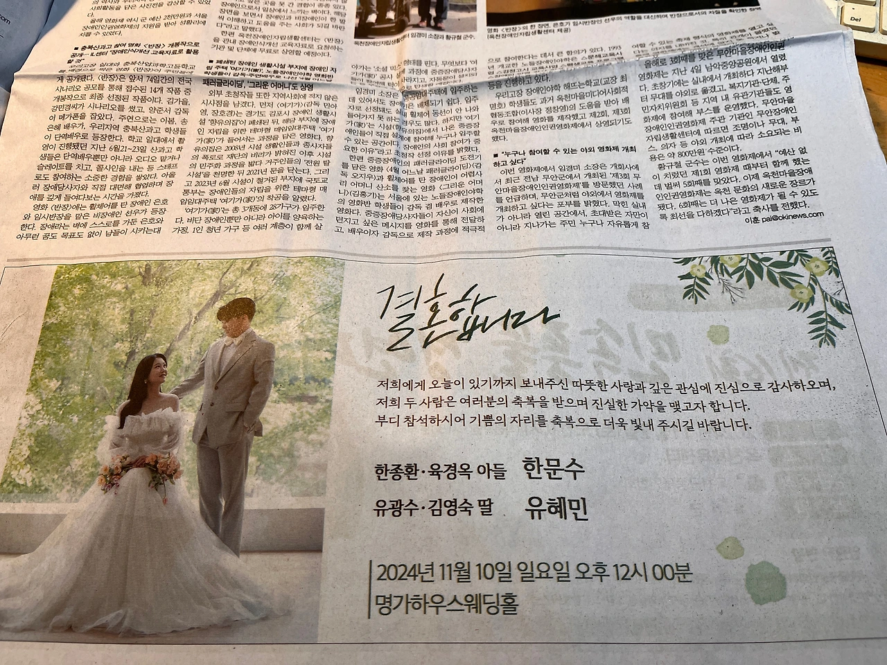 "우리 결혼합니다. 축하해 주세요. -신랑 000, 신부 000"