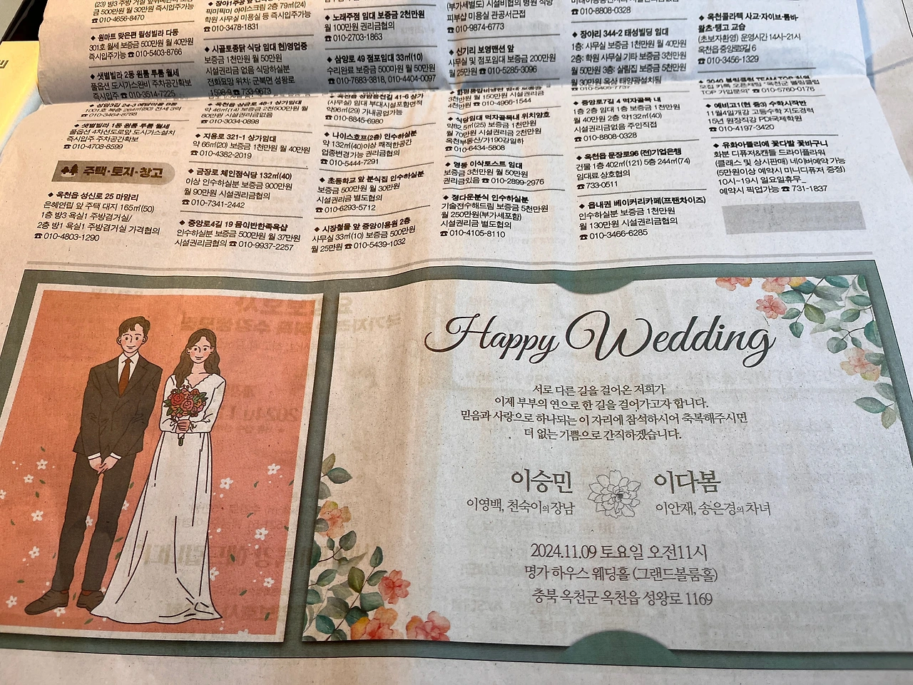 <옥천신문>에도 2개 면에 결혼광고가 실려 있다. 이처럼 잘 나가는 지역신문에는 평범한 시민들의 축하광고가 많다는 게 특징이다.