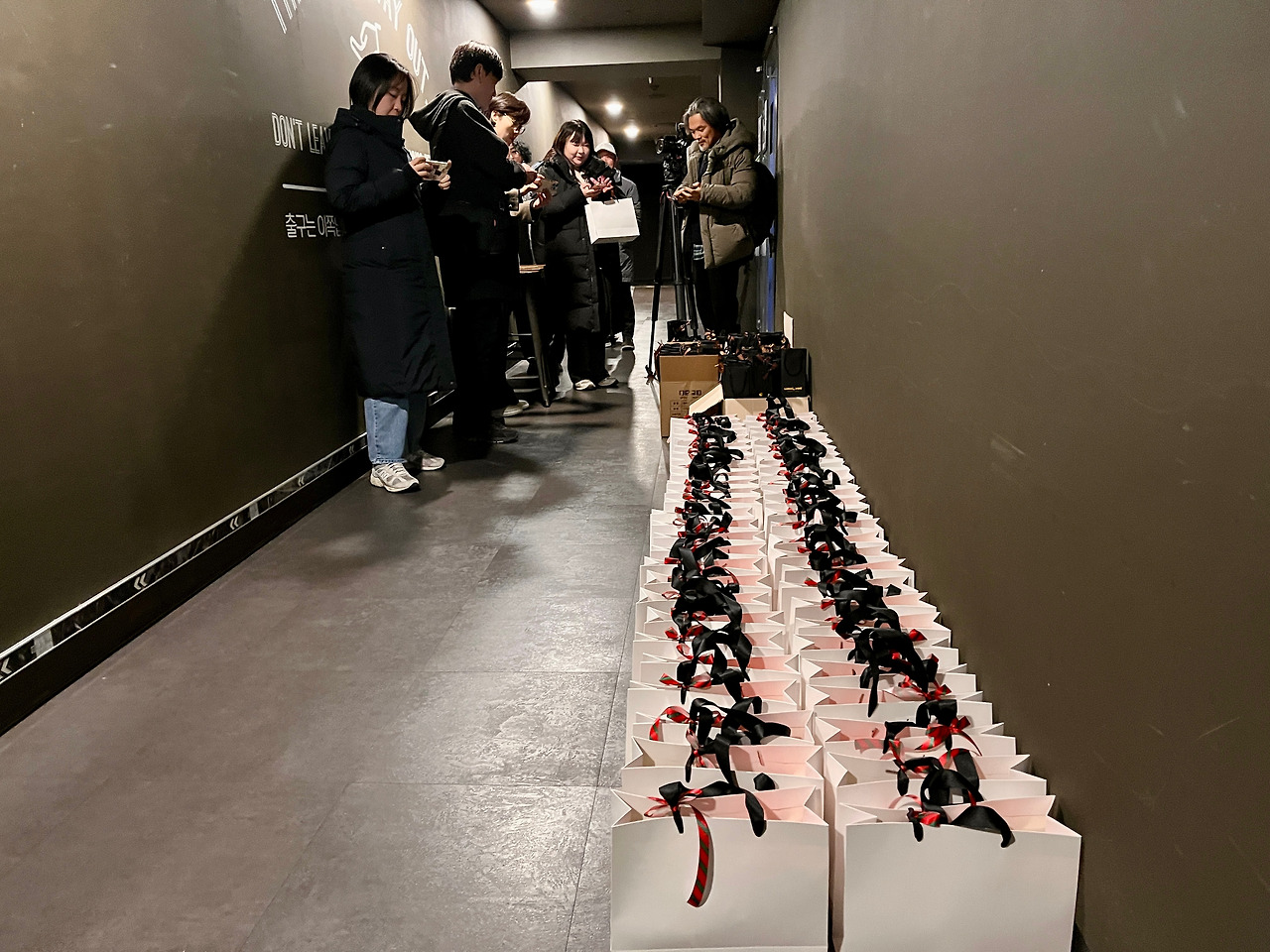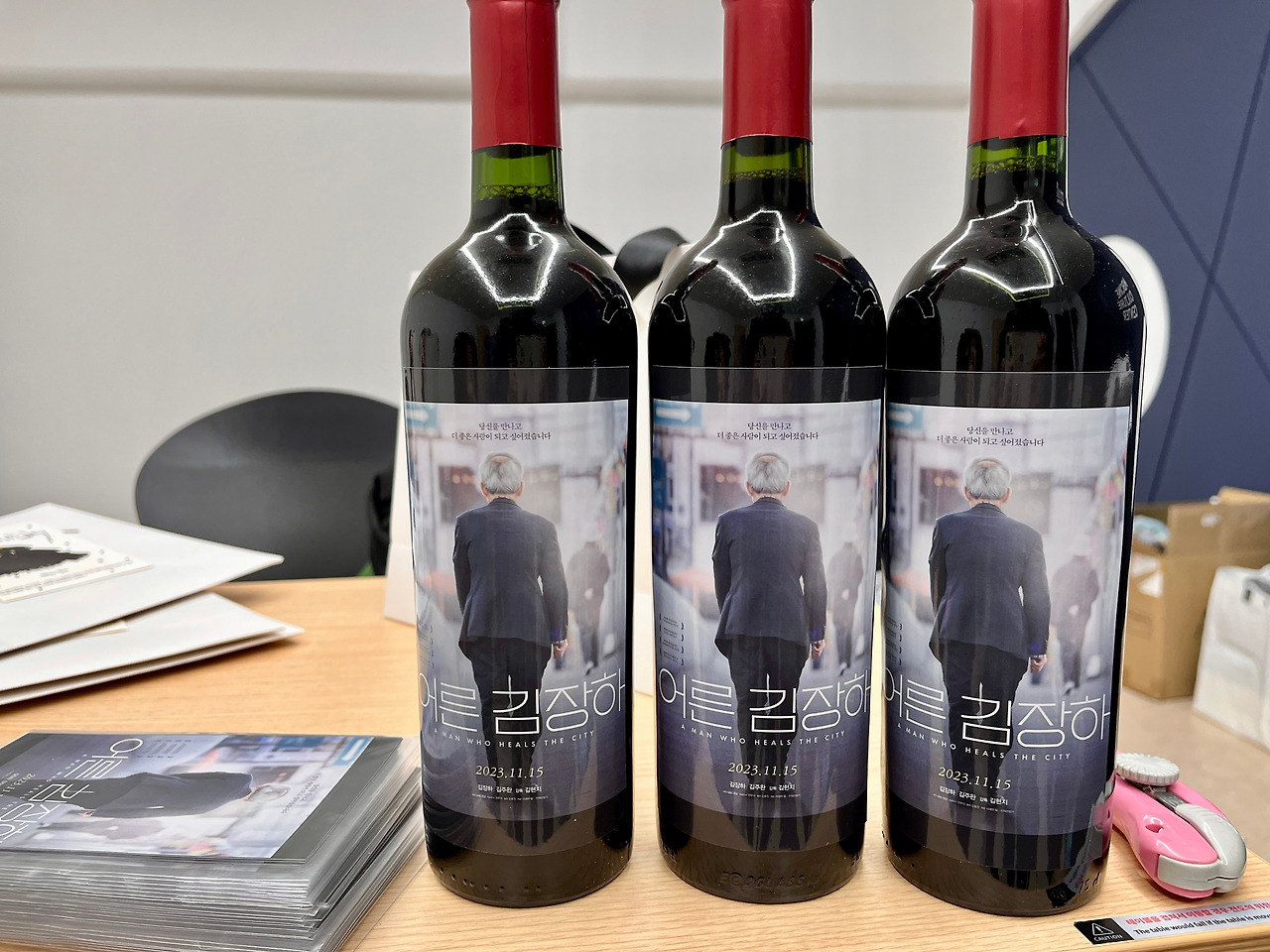 그뿐이 아니었다. 성탄절 파티에서 먹으라며 칠레산 꼰띠고 까베르네 소비뇽 와인도 관객 모두에게 한 병씩 선물했는데, <어른 김장하> 영화포스터가 와인병 라벨 위에 붙어 있었다. 미성년 관객 3명에겐 와인 대신 현금 5만 원이 든 세뱃돈 봉투가 주어졌다. 이 봉투도 미리 준비해 온 것이었다. 또 관객뿐 아니라 극장에서 일하는 청소노동자 4명에게도 같은 선물이 전달됐다.